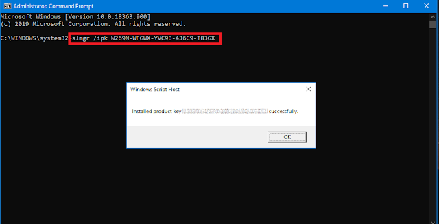 Now type in command “slmgr /ipk yourlicensekey” in my case its Windows 10 pro. Here is how it will look like: slmgr /ipk W269N-WFGWX-YVC9B-4J6C9-T83GX